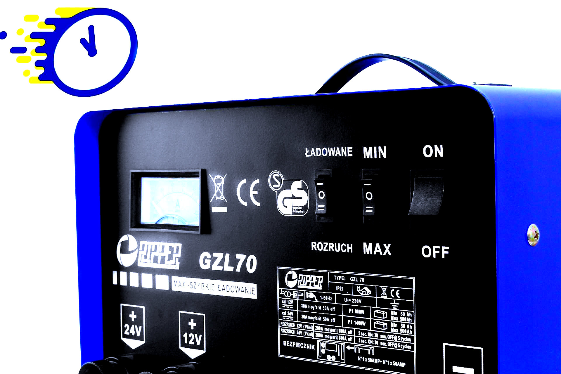 Nabíječka GZL-70 je vybavena funkcí FAST CHARGE, která umožňuje ještě rychlejší nabíjení baterie, což se hodí zejména při urgentní potřebě rychle nabít baterii.