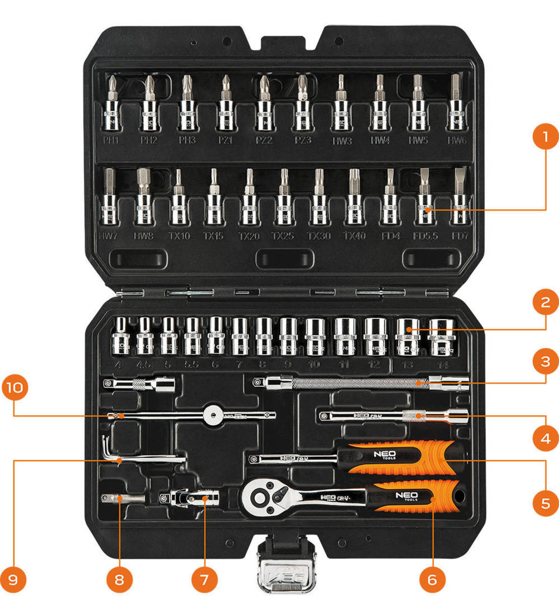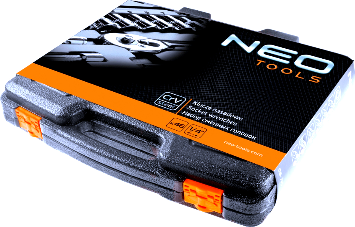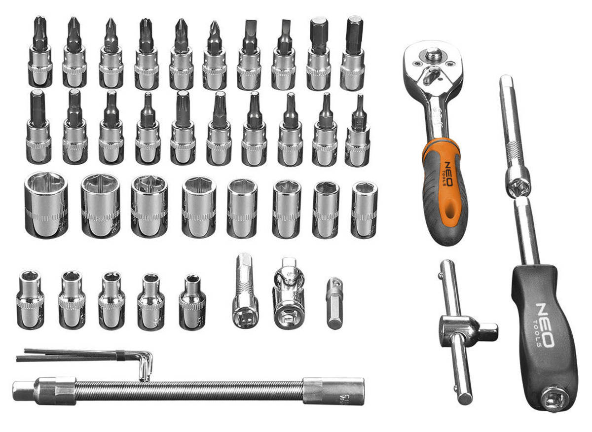 Sada nástrčkových klíčů 1/4" NEO TOOLS, která se skládá z 46 prvků, vyrobených z vysoce kvalitní chrom-vanadové oceli. Sada obsahuje ráčnu, která je vybavena trvalým západkovým mechanismem (72 zubů).