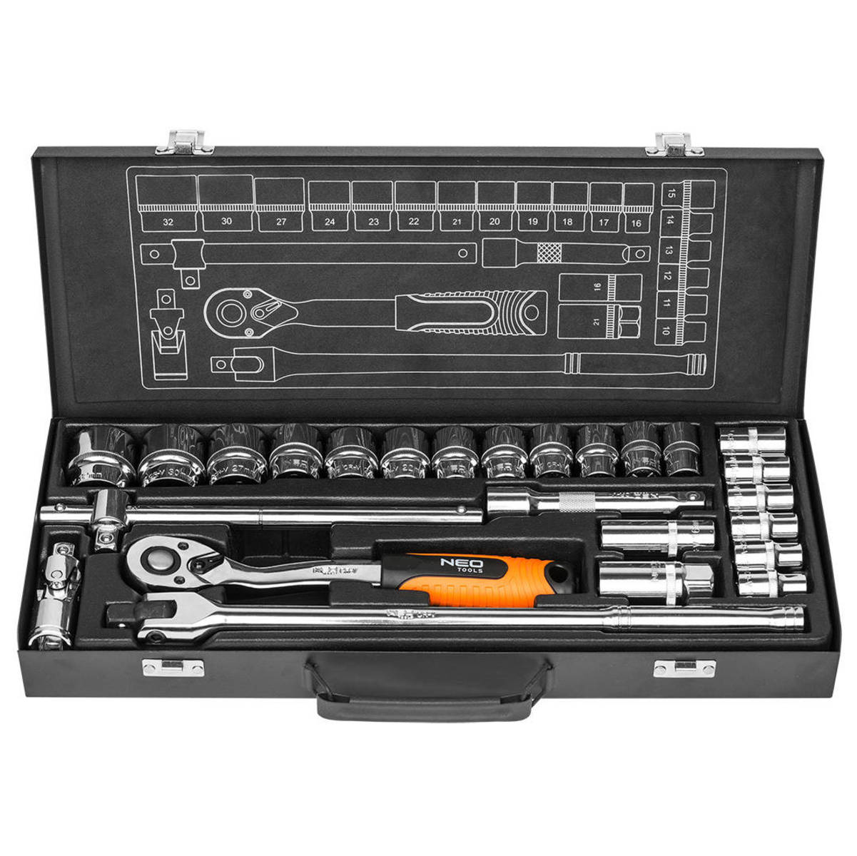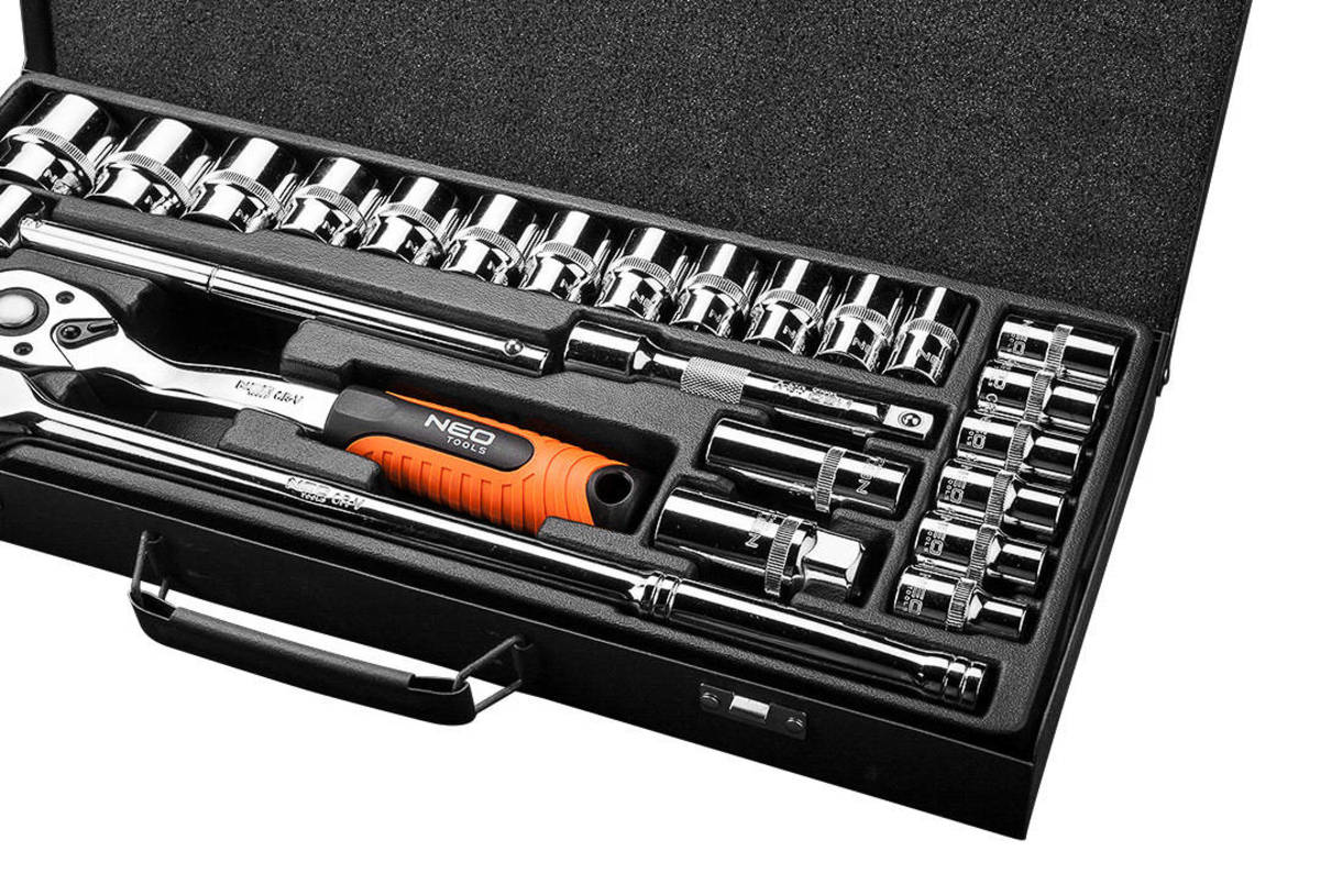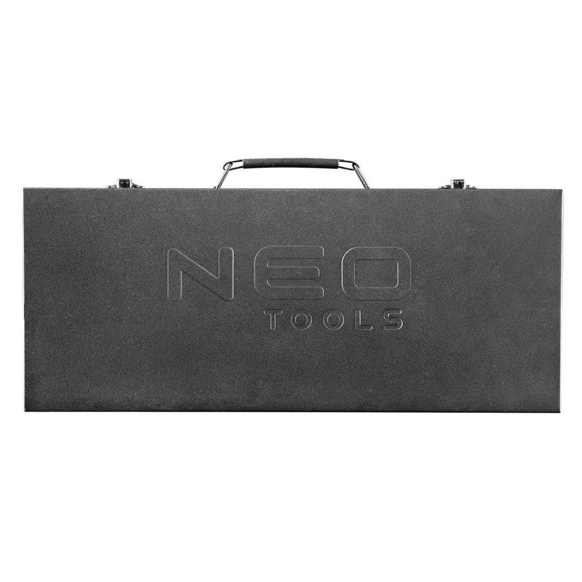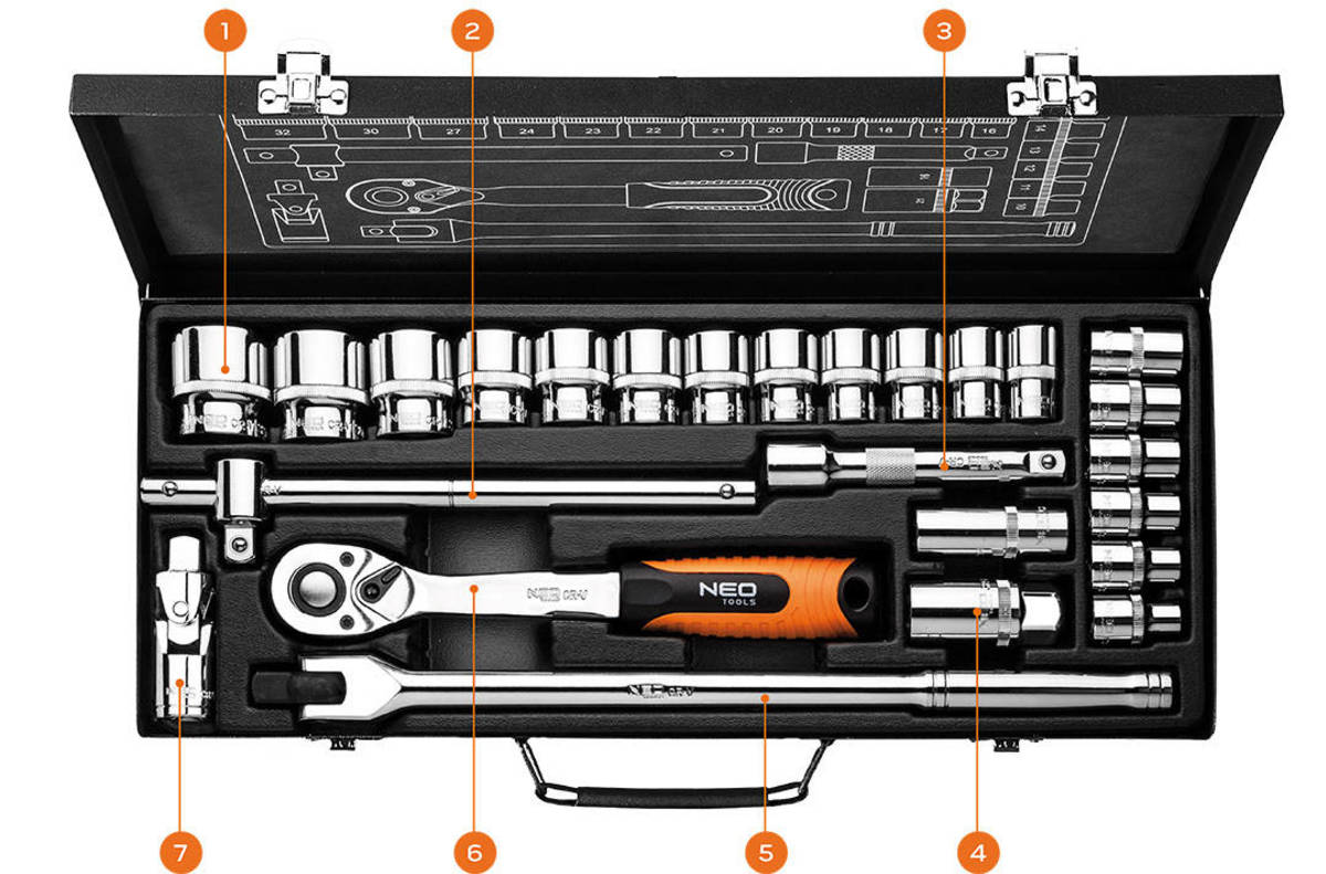 Profesionální sada nářadí NEO Tools 25dílná 1/2" je ideální volbou pro mechaniky i náročné domácí kutily. Obsahuje ráčnu s permanentním ráčnovým mechanismem (72 zubů) a ergonomicky tvarovanou rukojetí pro pohodlnou práci. Součástí balení je sada 18 šestihranných hlavic s čitelným reliéfním značením (od 10 do 32 mm), nástavce na zapalovací svíčky, univerzální kloub, prodloužení, kloubová rukojeť a páka se záchytkou. Celá sada je uložena v robustním kovovém kufru s pevnými západkami pro bezpečné skladování i transport. Vše vyrobeno z odolné CrV oceli a certifikováno TÜV Rheinland pro maximální spolehlivost.