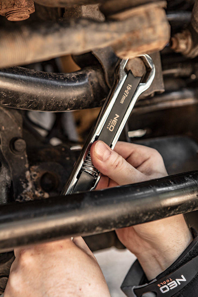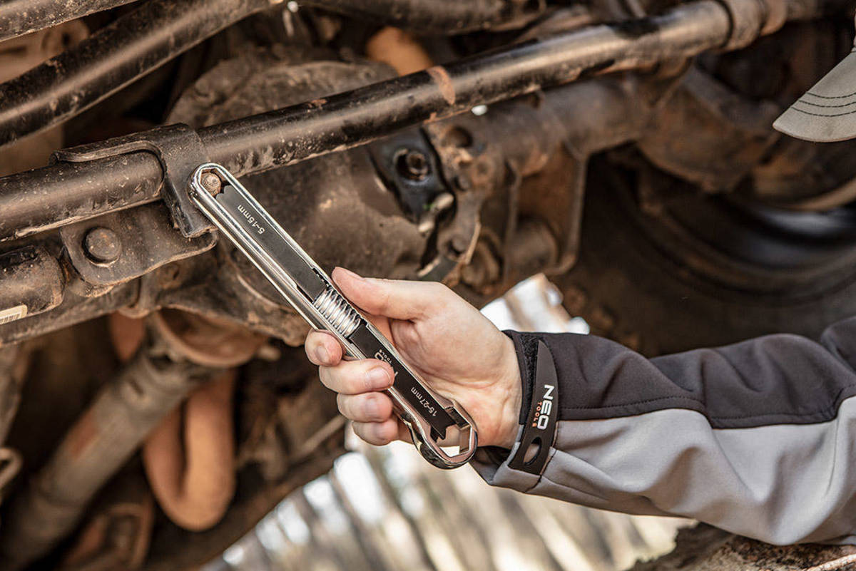 Klíč očkový nastavitelný, oboustranný NEO Tools 03-031 (5-27 mm) – Univerzální, oboustranný nastavitelný klíč s plynulým nastavením velikosti od 5 mm do 27 mm, vyrobený z kované Cr-V oceli. Poskytuje čtyři body dotyku se šroubem pro maximální přenos síly a je vhodný pro metrické i palcové šrouby.