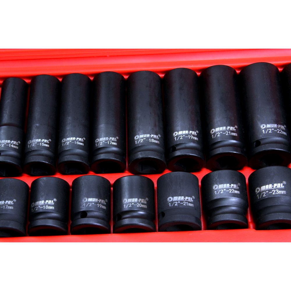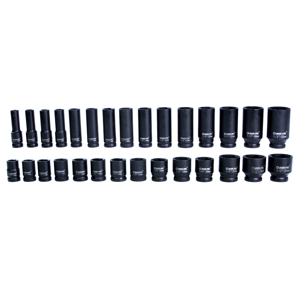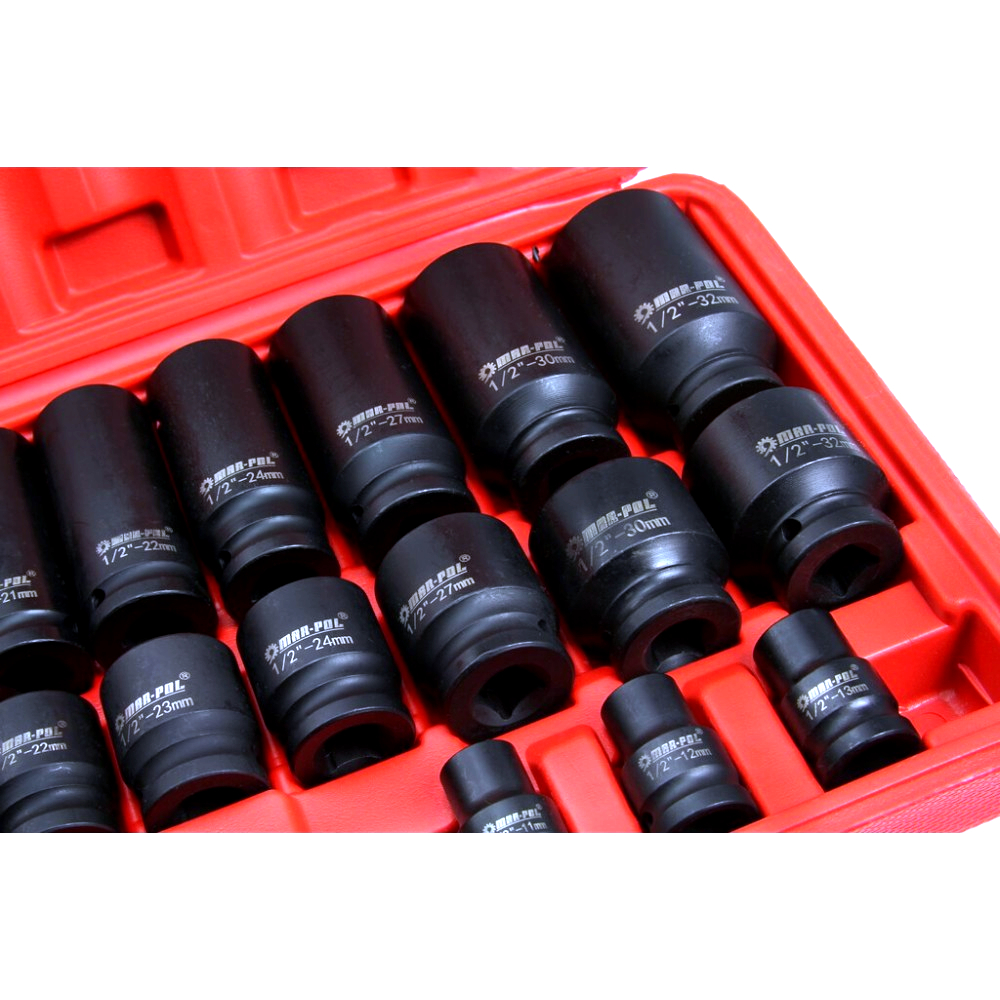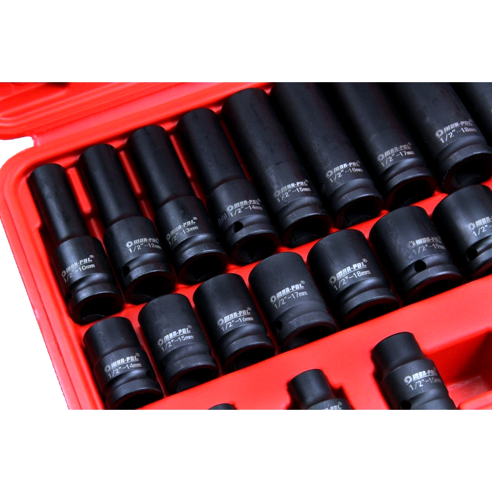 Profesionální 35dílná sada kovaných šestihranných rázových hlavic s uchycením 1/2" je určena pro náročné práce v autodílnách, servisech i domácích garážích. Hlavice jsou kompatibilní s pneumatickými i elektrickými rázovými utahováky a jsou vhodné pro běžné i intenzivní použití.