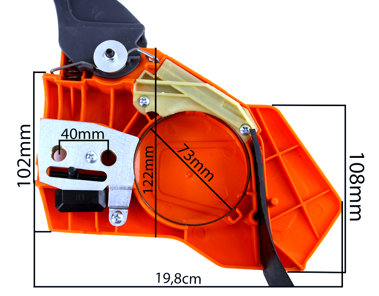 Bezpečnostní kryt s brzdou slouží k ochraně uživatele před poraněním způsobeným náhlým pohybem řetězu. Ideální pro výměnu u poškozených nebo opotřebovaných dílů. Kompatibilní s širokou škálou motorových pil rôznych značek.