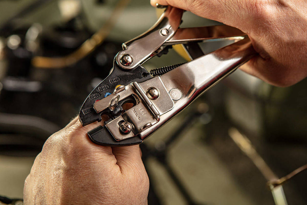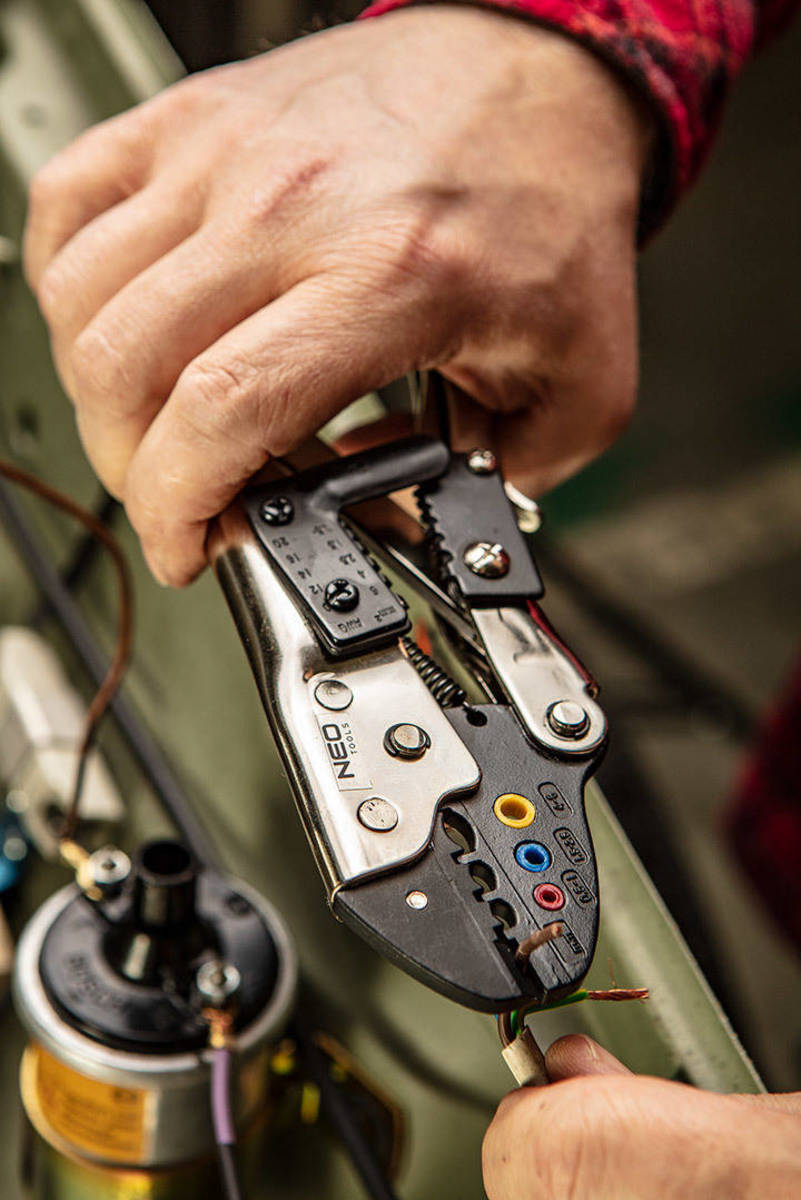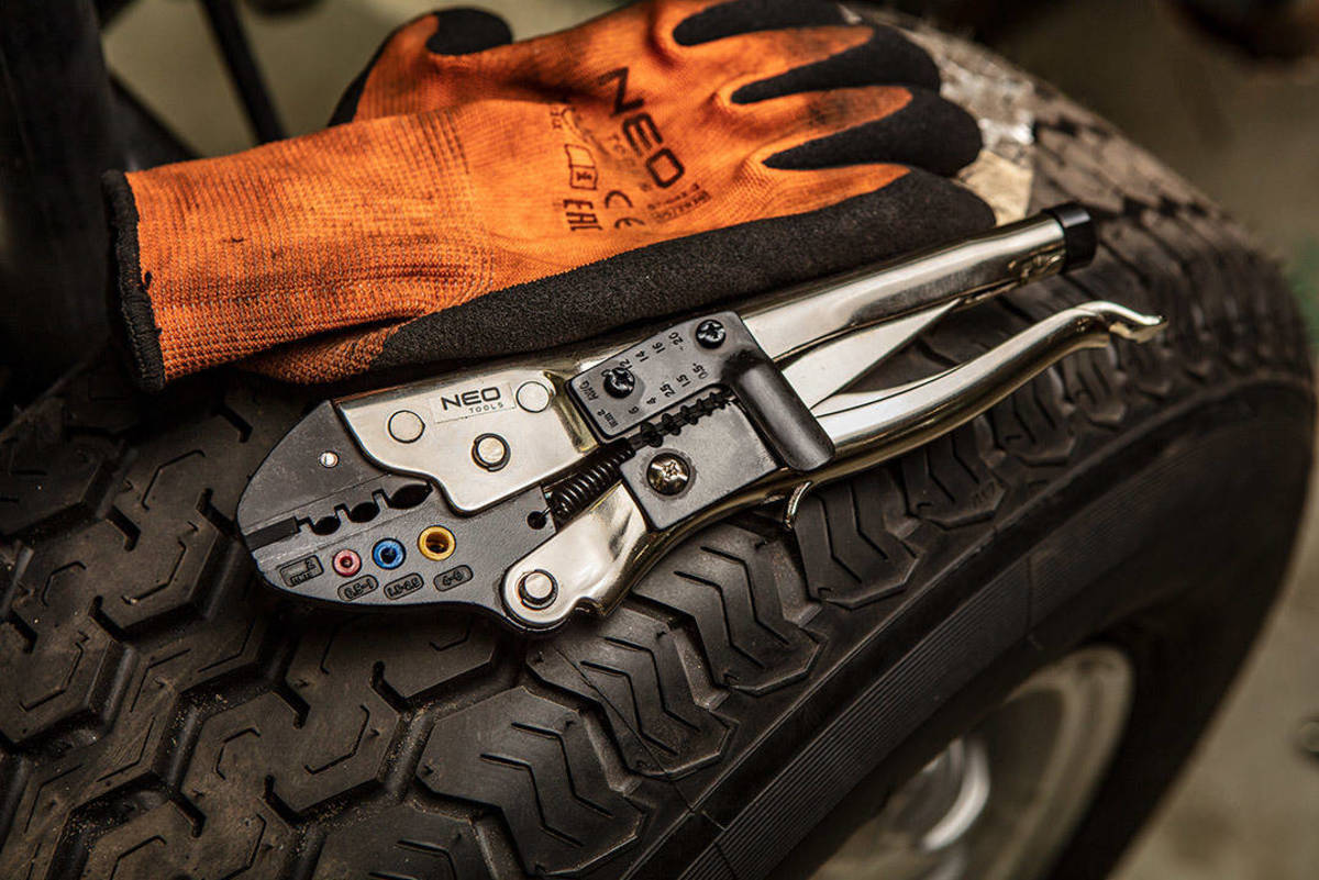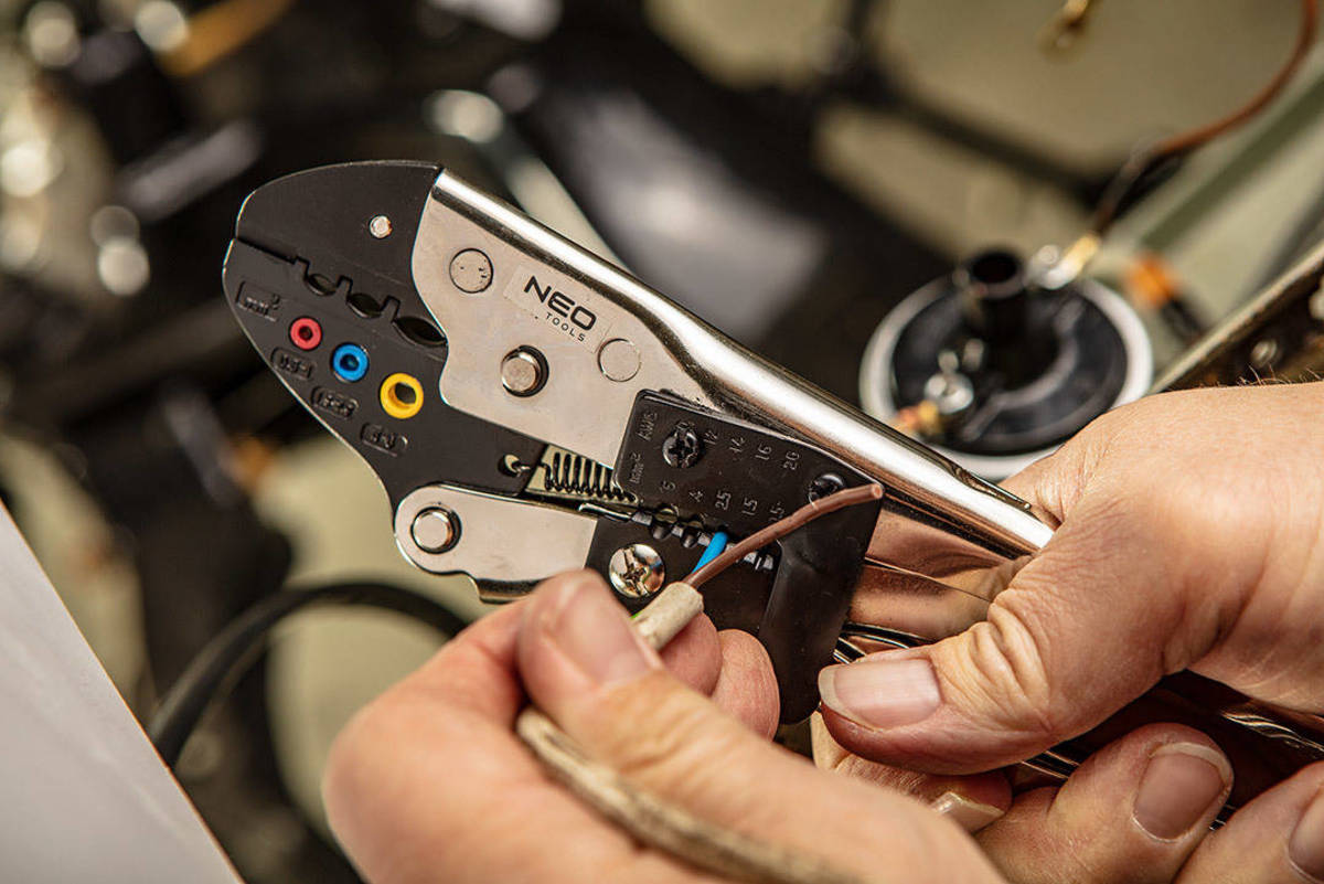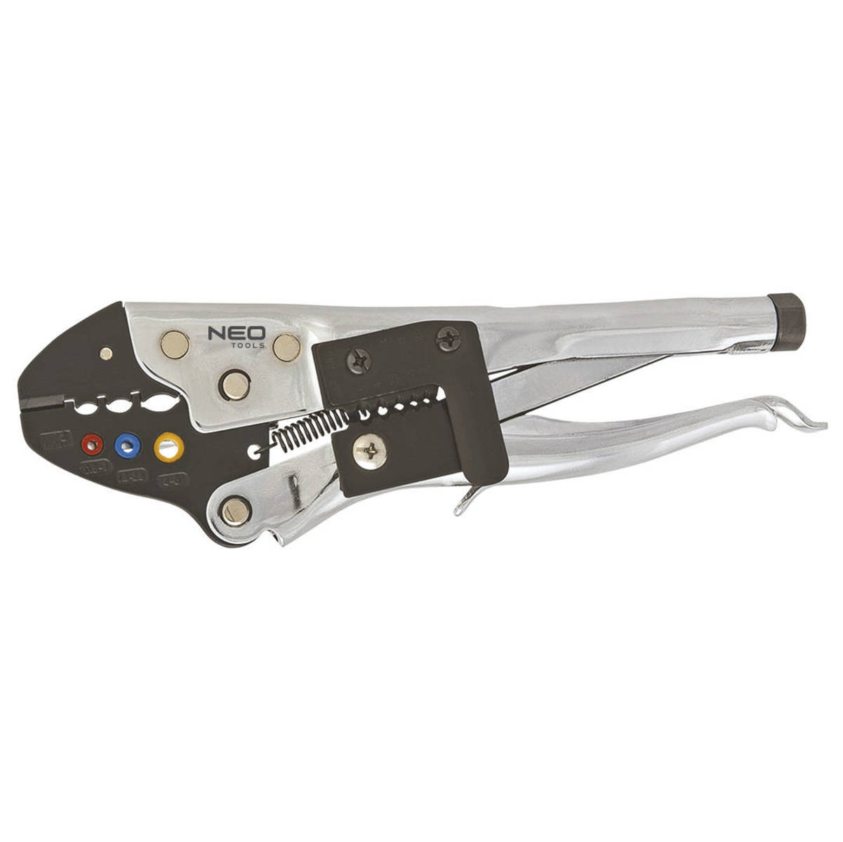 Lisovací kleště pro konektorové koncovky NEO Tools 01-505 – Univerzální nástroj s funkcí lisování, řezání a odizolování, vhodný pro konektory 20-10 AWG. Certifikováno TÜV s komfortními TPR rukojeťmi.