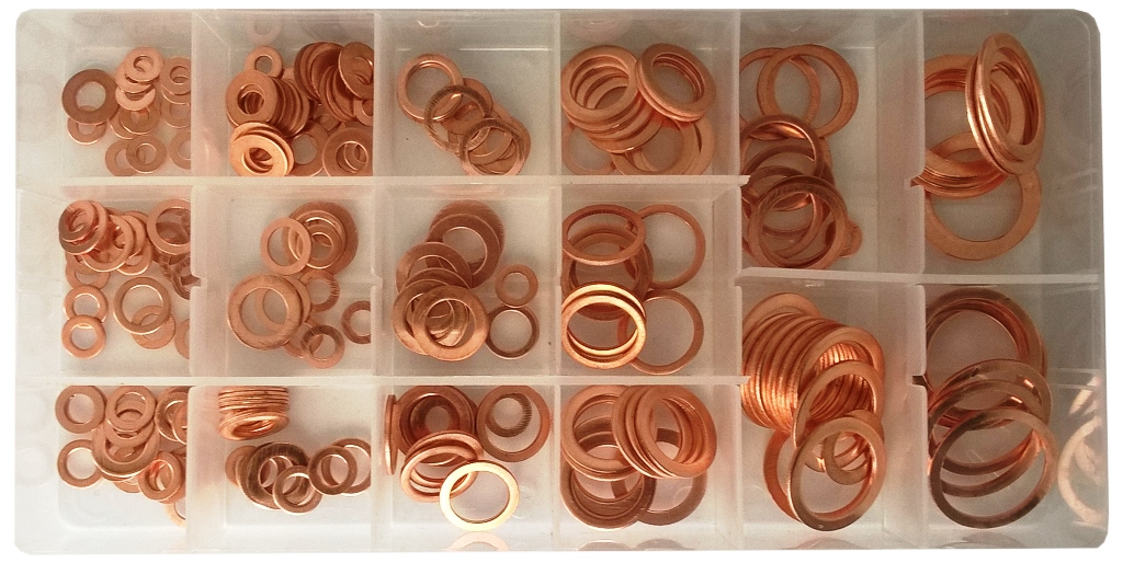Univerzální sada těsnění pro autoservis, průmyslové i domácí použití. Měděné podložky vynikají vysokou odolností vůči teplu, tlaku a korozi, a jsou ideální pro těsnění spojů v olejových, palivových i hydraulických systémech.