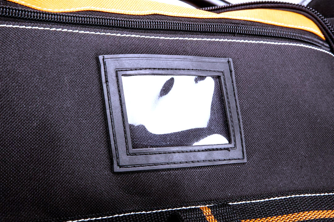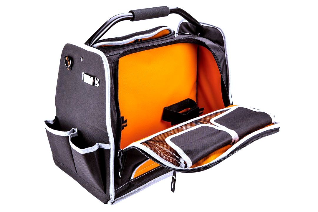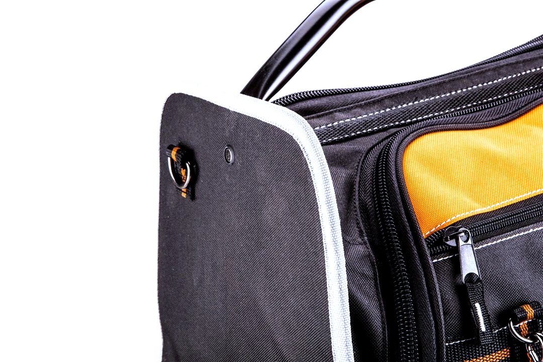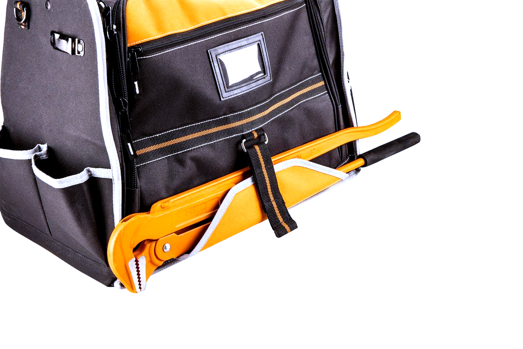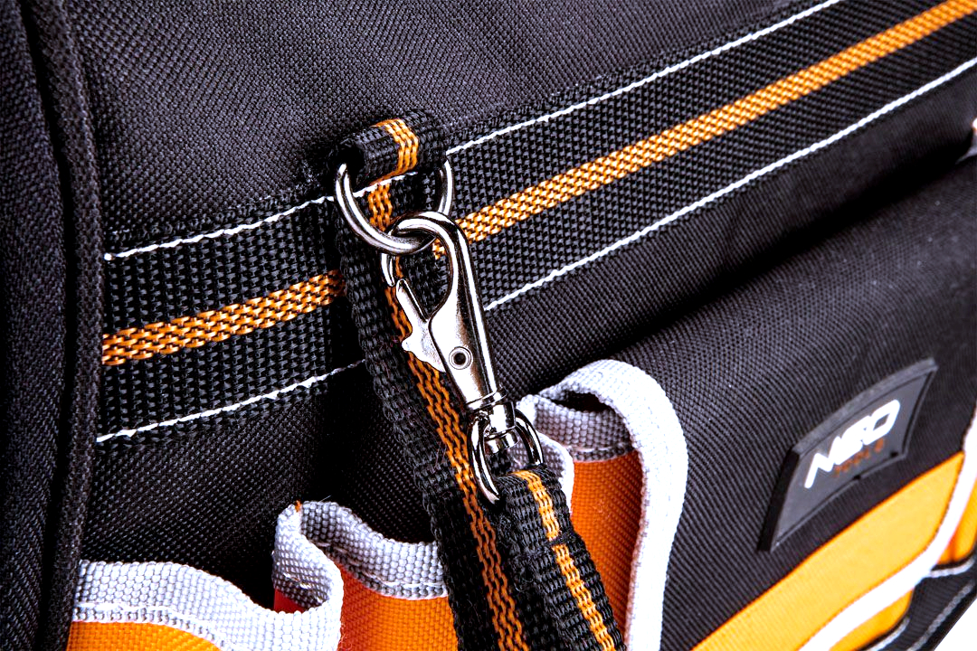 Montérská taška NEO polyester 600D, pevná profilovaná rukojeť, 32 vnitřních kapes, 12 vnějších kapes, pevná konstrukce, háček na měrku, dvě hlavní komory, okénko na personalizovanou etiketu, zpevněné zipy.