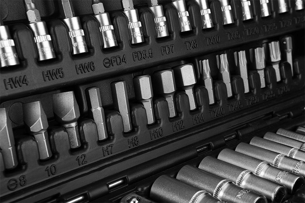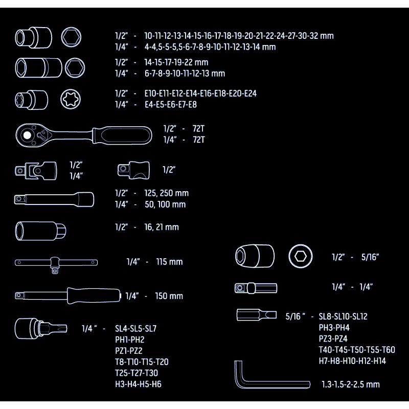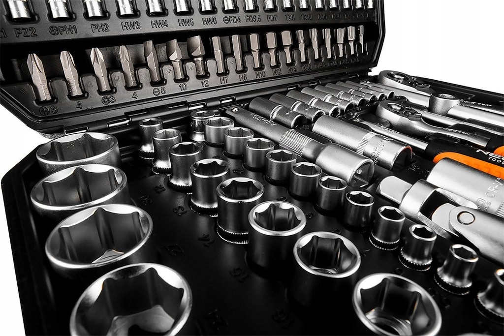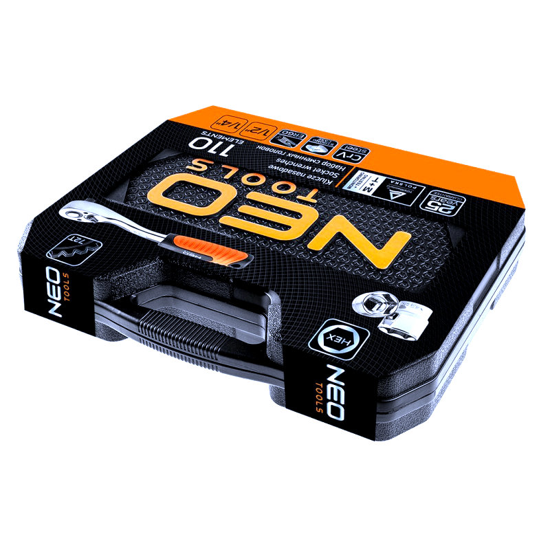 Sada nástrčkových klíčů 1/2“ a 1/4" NEO (ref. č. 08-666) obsahuje celkem 110 vysoce kvalitních prvků z chrom-vanadiové oceli. Součástí sady jsou ohnuté ráčny s trvalým západkovým mechanismem (72 zubů) a ergonomickými rukojeťmi v rozměrech 1/2" a 1/4". Sada zahrnuje širokou škálu šestiúhelníkových nástrček v různých délkách (velikosti 4–32 mm), nástrček Torx (E4–E24) a šroubovací koncovky (ploché, křížové, šestiúhelníkové, Torx). K sadě patří i rozsáhlé příslušenství.