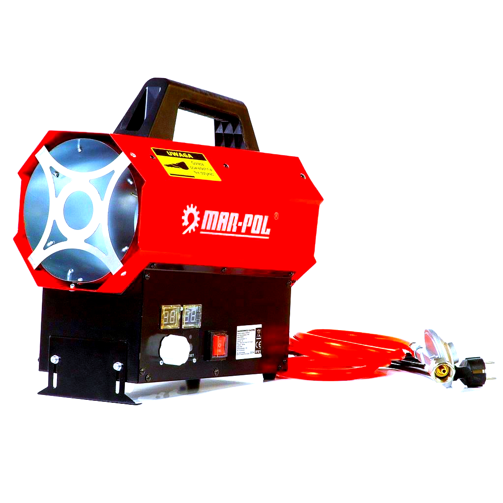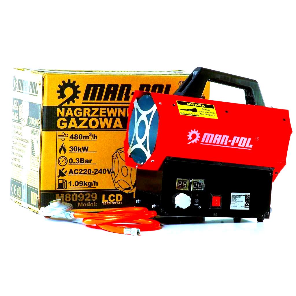 Profesionální plynový ohřívač MAR-POL M80929 s výkonem 30 kW, LCD displejem a termostatem. Ideální pro vytápění nebytových prostor – dílen, hal a staveb.