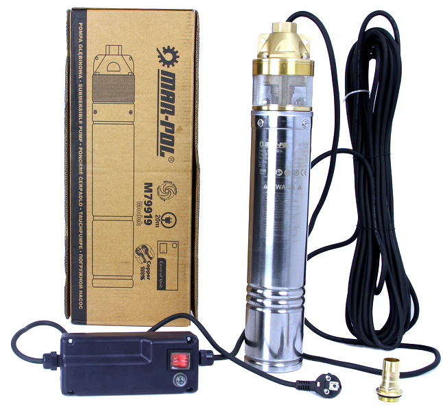 Součástí balení je 20metrový napájecí kabel a CONTROL BOX s hlavním vypínačem, kondenzátorem a tepelnou ochranou. Motor s 100% měděným vinutím zajišťuje dlouhou životnost a maximální účinnost při nízké spotřebě energie. Jedinou podmínkou je, aby bylo čerpadlo během provozu zcela ponořeno.