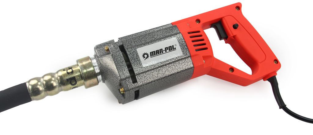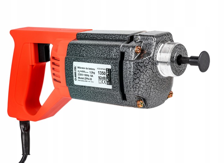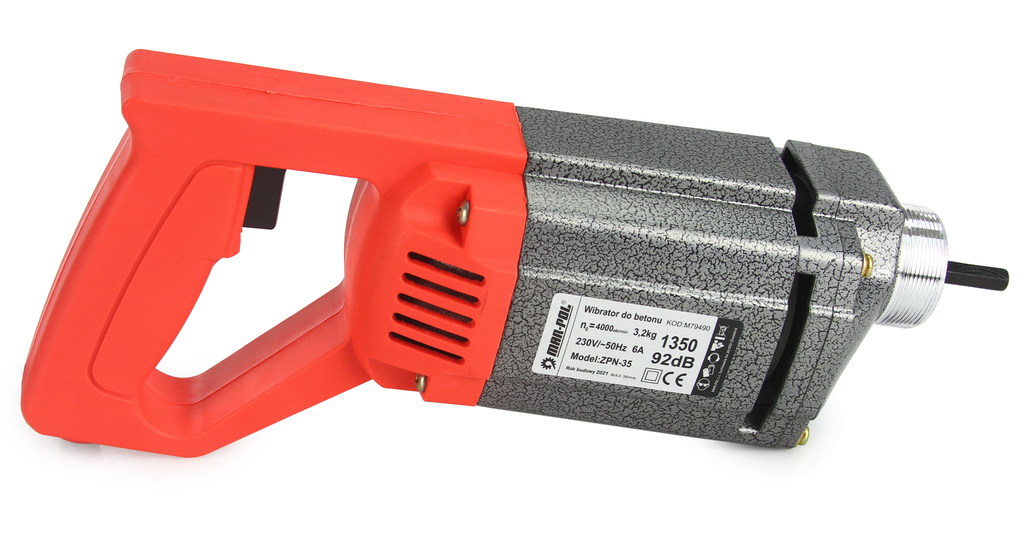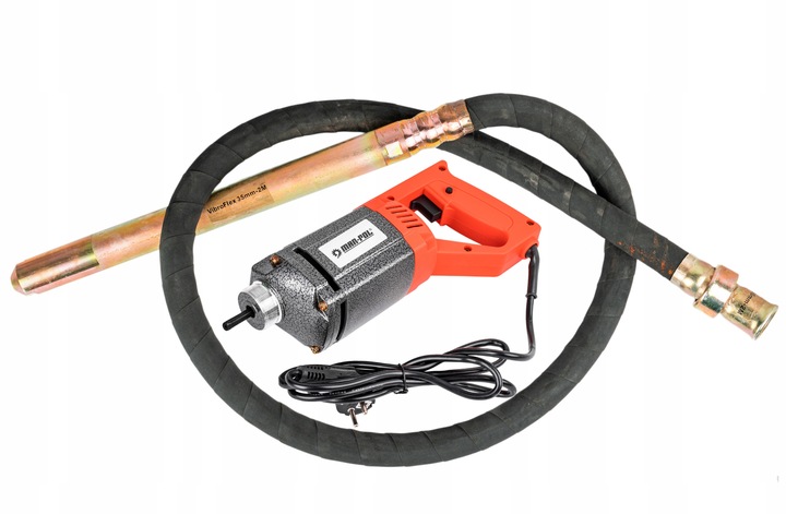 Elektrický ponorný vibrátor do betonu MAR-POL M79490, výkon 1350 W, hadice 2 mx 35 mm, ideální pro zhutňování betonu při stavbě základů, podlah, stěn a sloupů. Robustní konstrukce s měděným vinutím a hliníkovým tělem.