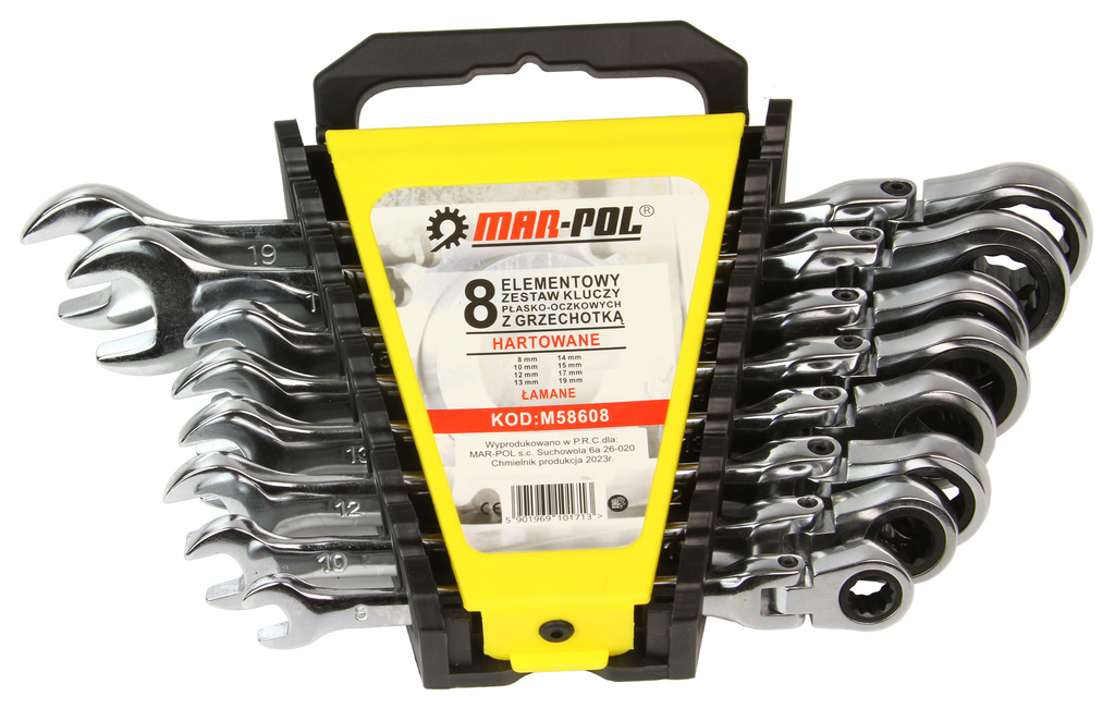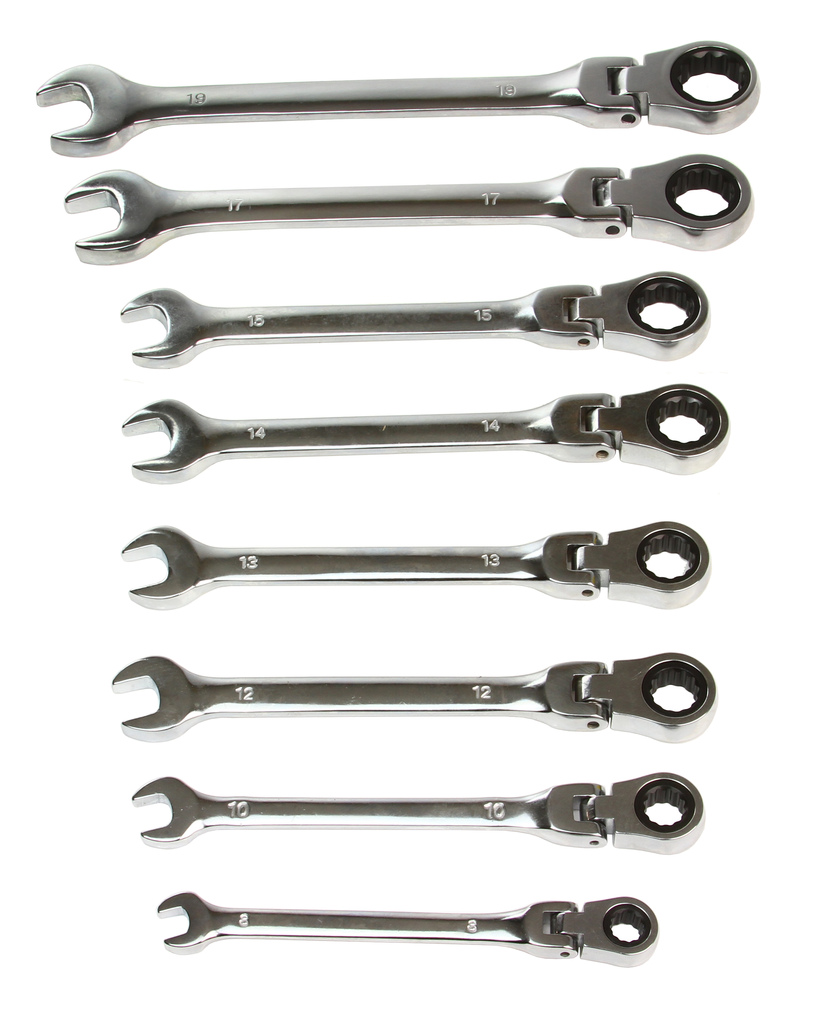 Sada 7 kloubových ráčnových klíčů z chrom-vanadiové oceli s jemným 5° zdvihem, ideální do těsných prostor. Vhodné pro profesionály i domácí kutily. Balení obsahuje velikosti 8–19 mm v praktickém pouzdru.