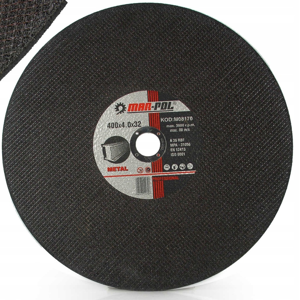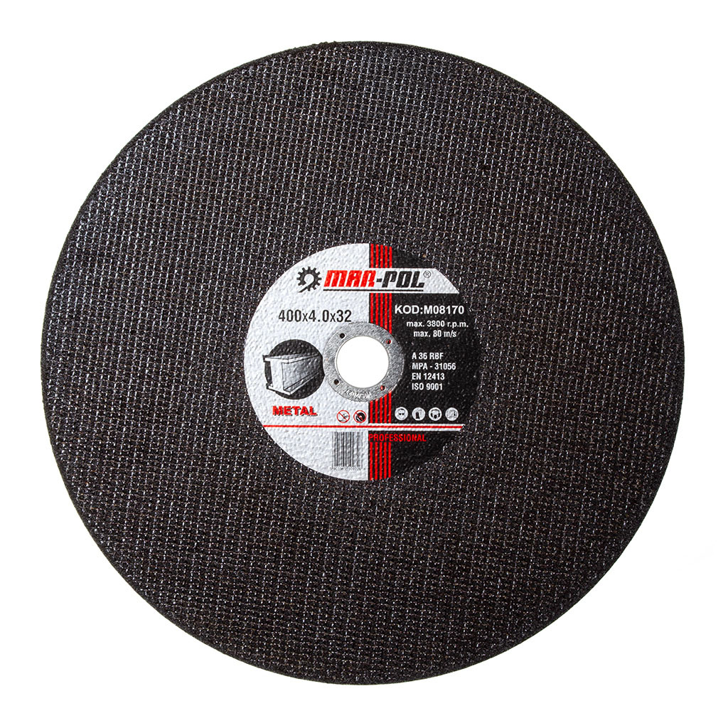 Řezný kotouč MAR-POL M08170 na kov, uhlíkovou ocel, INOX a hliník, průměr 400 mm, tloušťka 4 mm, vnitřní průměr 32 mm, profesionální použití s maximální rychlostí 80 m/s.