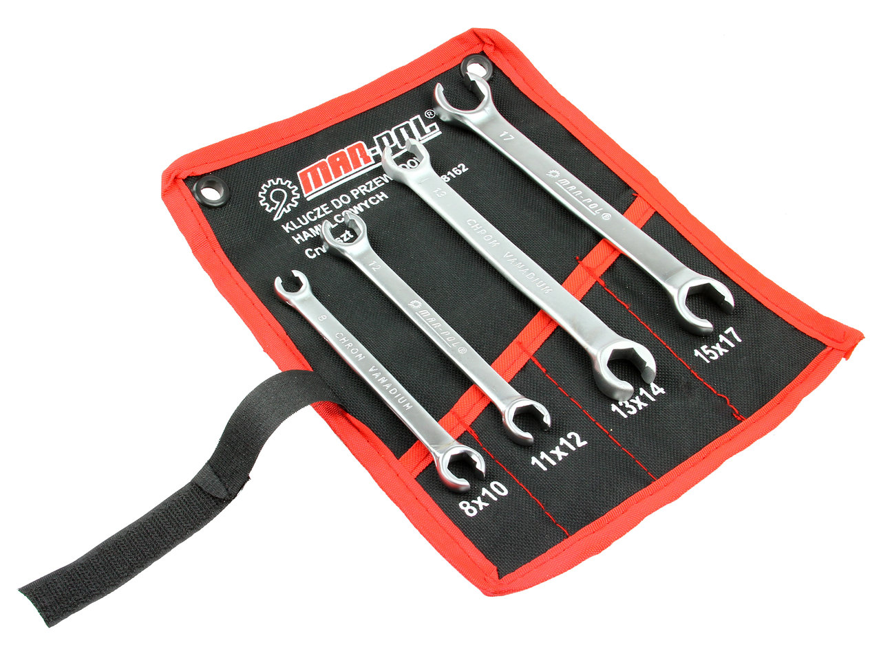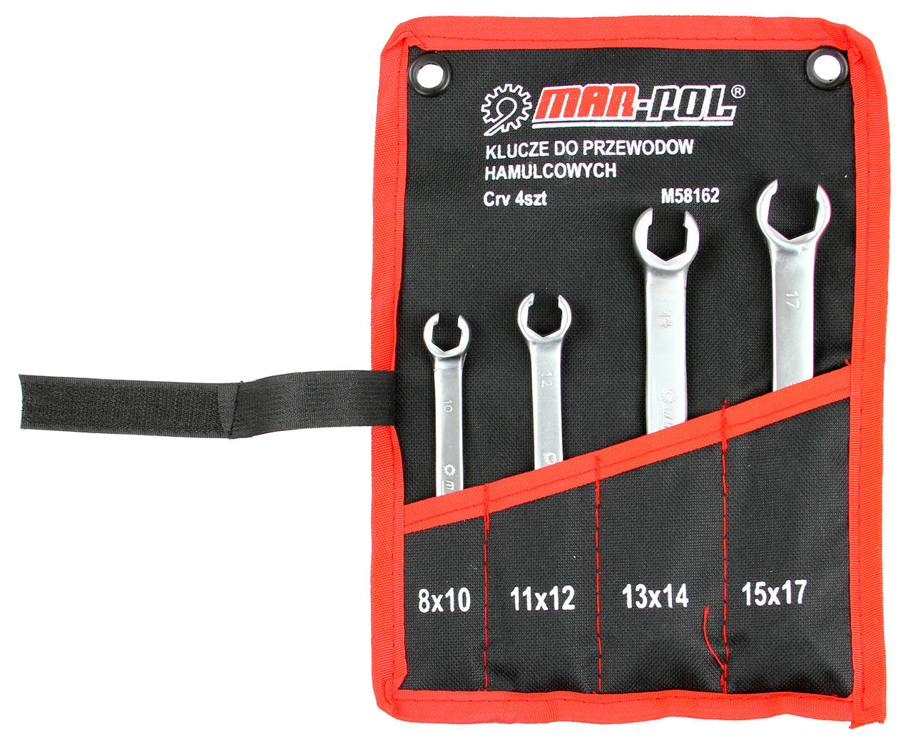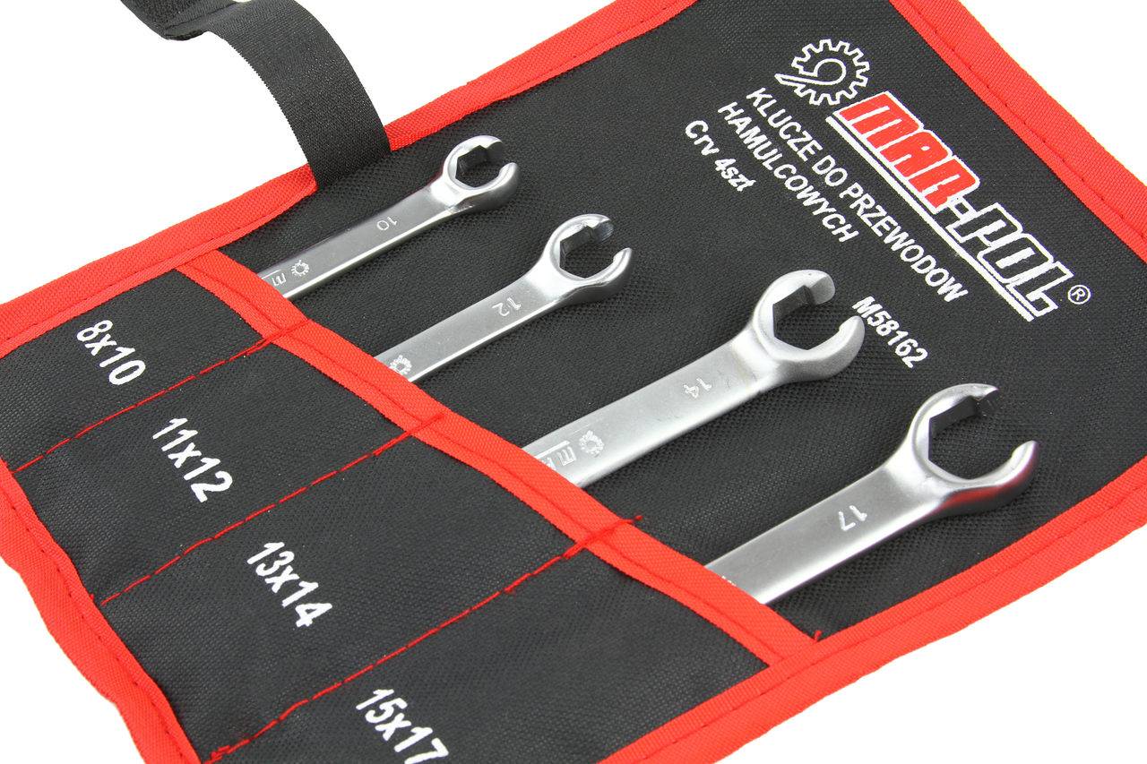 Klíče na brzdové trubky MAR-POL M58162 – precizní 4-dílná sada profesionálních klíčů z chrom-vanádové oceli s praktickým pouzdrem. Ideální pro autoservisy, dílny a opravy brzdových systémů. Spolehlivé nářadí pro každého mechanika!