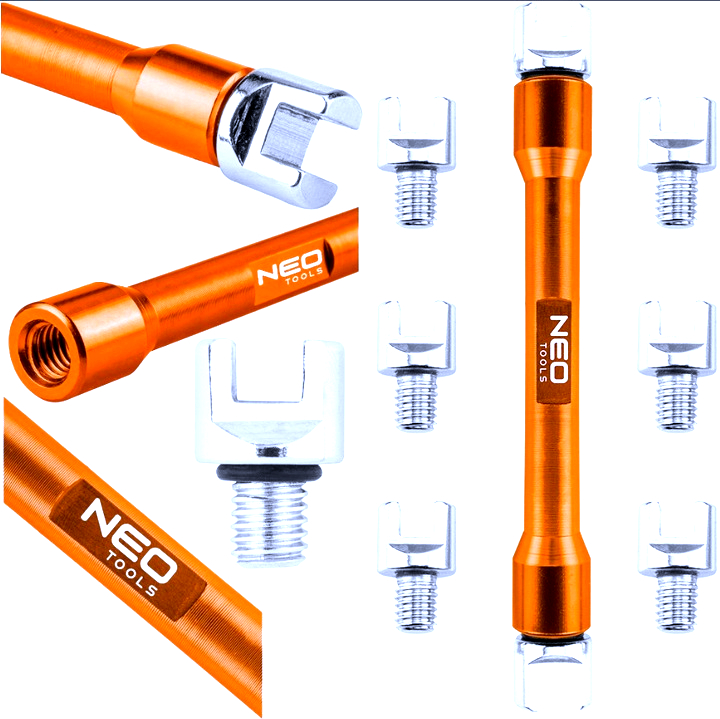 Sada klíčů na špice a koncovky kol motocyklu 9 ks NEO Tools 10-508 – Profesionální sada pro údržbu a opravu paprskových kol motocyklů. Obsahuje klíč a 8 vyměnitelných hrotů ve velikostech 4, 5, 5.6, 5.8, 6, 6.2, 6.4, 6.6, 6.8 mm, vhodných pro nejčastěji používané špice a koncovky. Ideální pro nastavení napětí paprsků a vyrovnání kol.