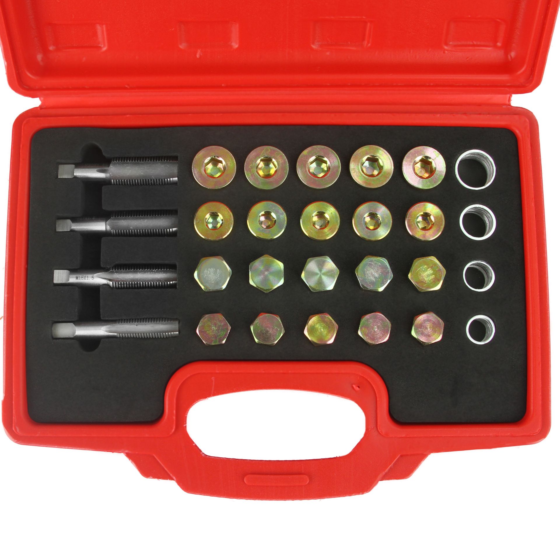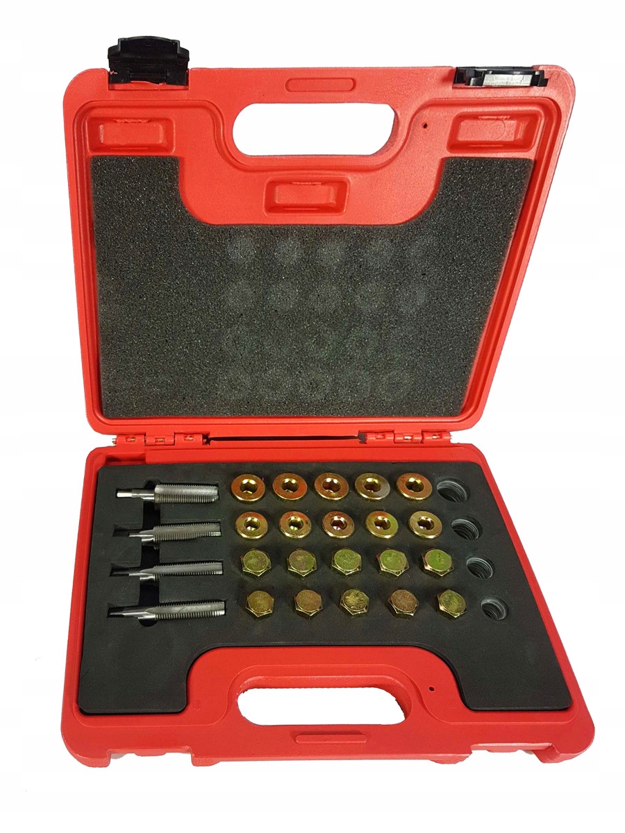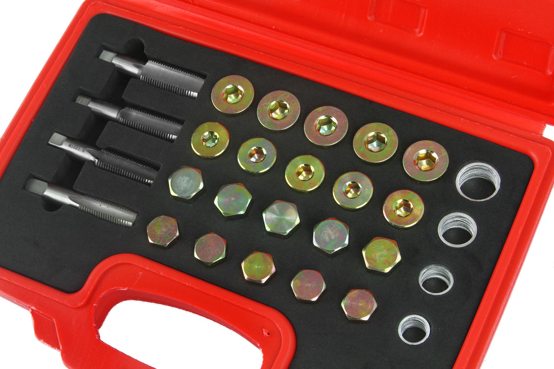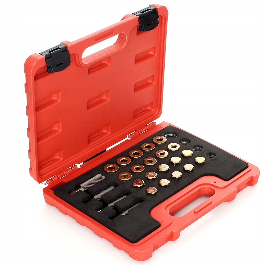 Sada pro opravu závitů vypouštěcích šroubů oleje MAR-POL M55890 obsahuje závitníky, náhradní šrouby a hliníkové O-kroužky pro rychlou opravu poškozených závitů bez potřeby výměny olejové vany. Vhodná pro šrouby M13, M15, M17, M20, s kompletním příslušenstvím v praktickém kufříku.