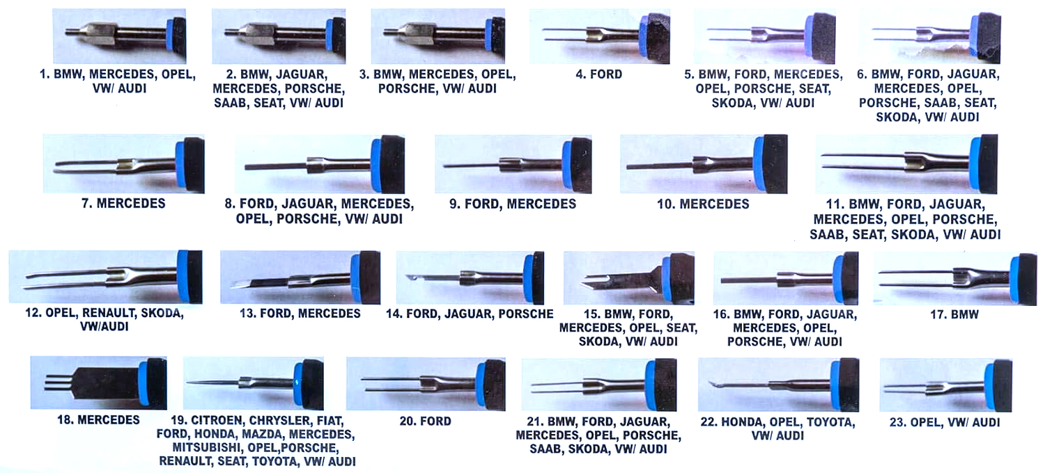 Vypichováky umožňují bezpečné a precizní vyjmutí kontaktů bez poškození konektoru, což je neocenitelné při opravách, výměně či úpravách elektroinstalace. Nástroje jsou vhodné pro konektory používané u většiny známých výrobců jako BMW, Mercedes, Audi, VW, Ford, Honda, Toyota a další.