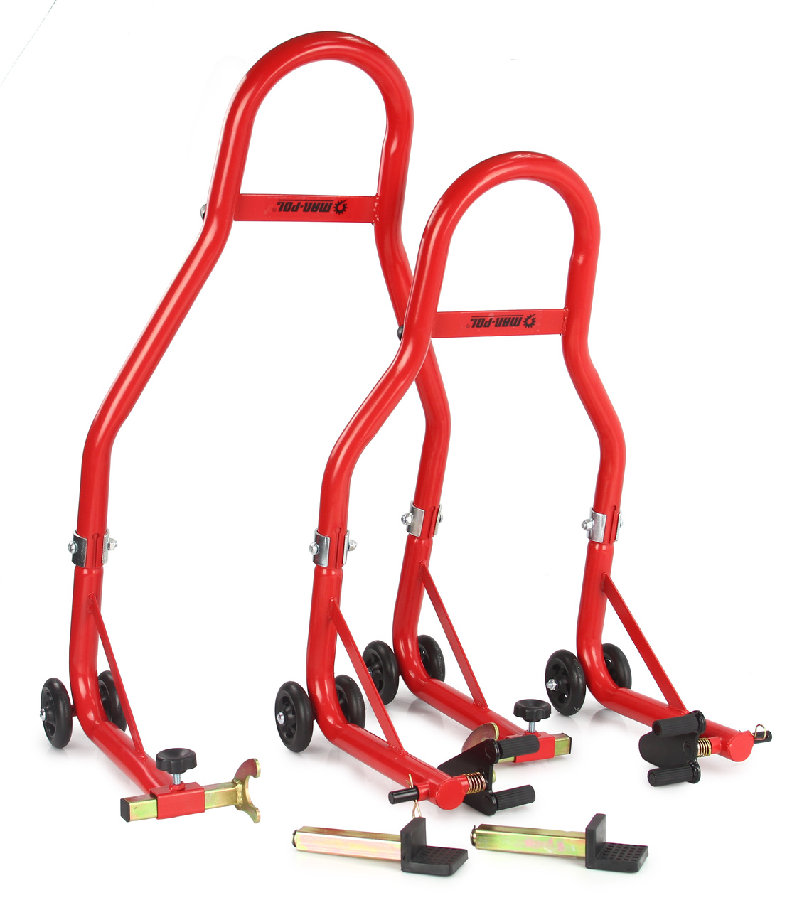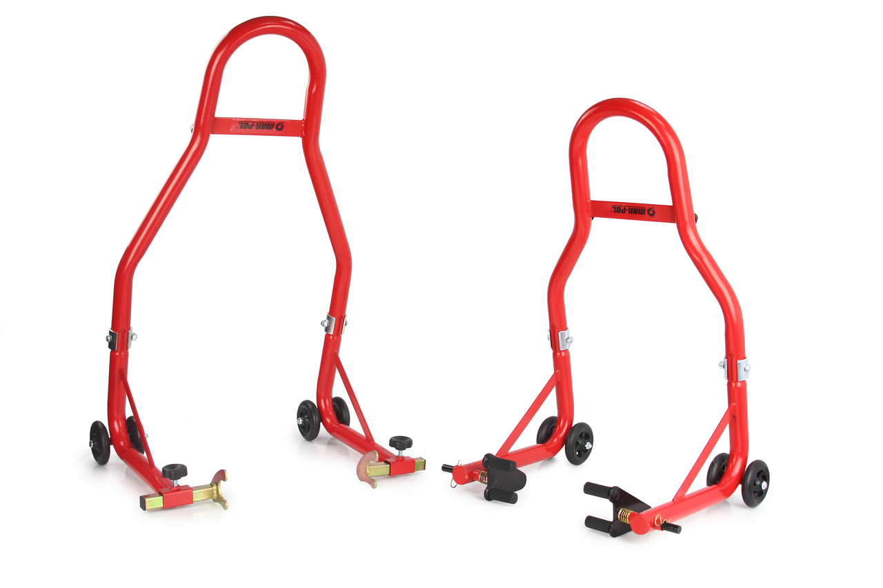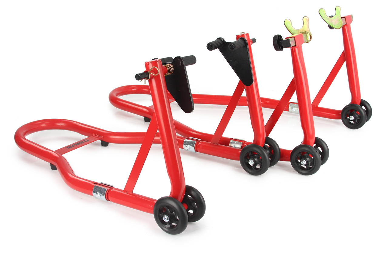 Stojany předního a zadního kola s nosnostmi 280 a 340 kg. Stojany disponují kolečky, která umožňují motocykl snadno přesouvat.