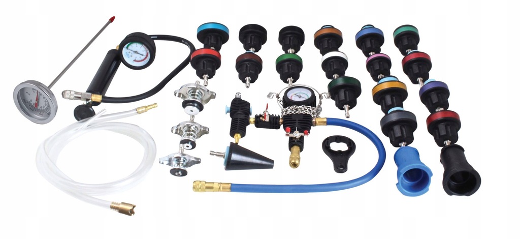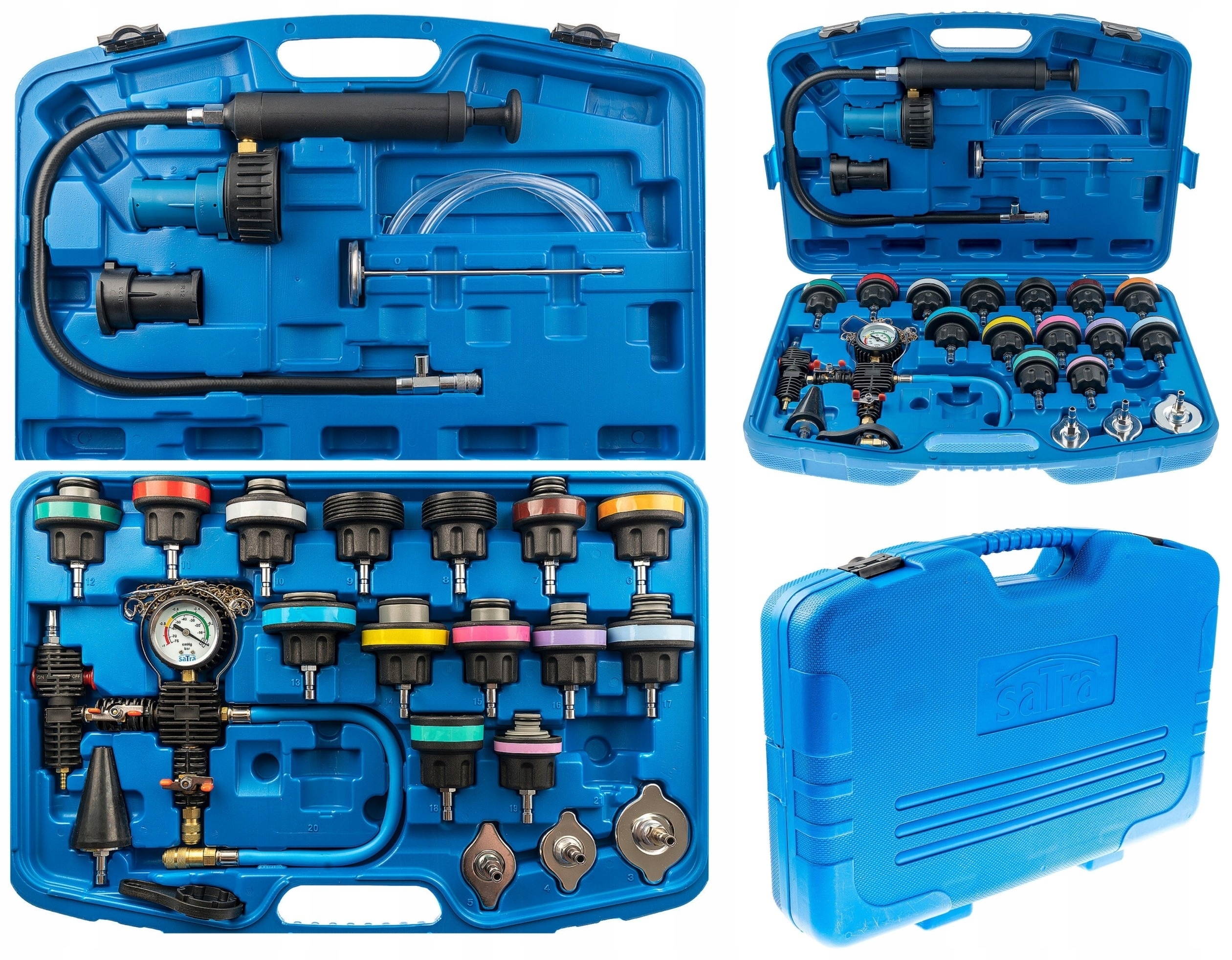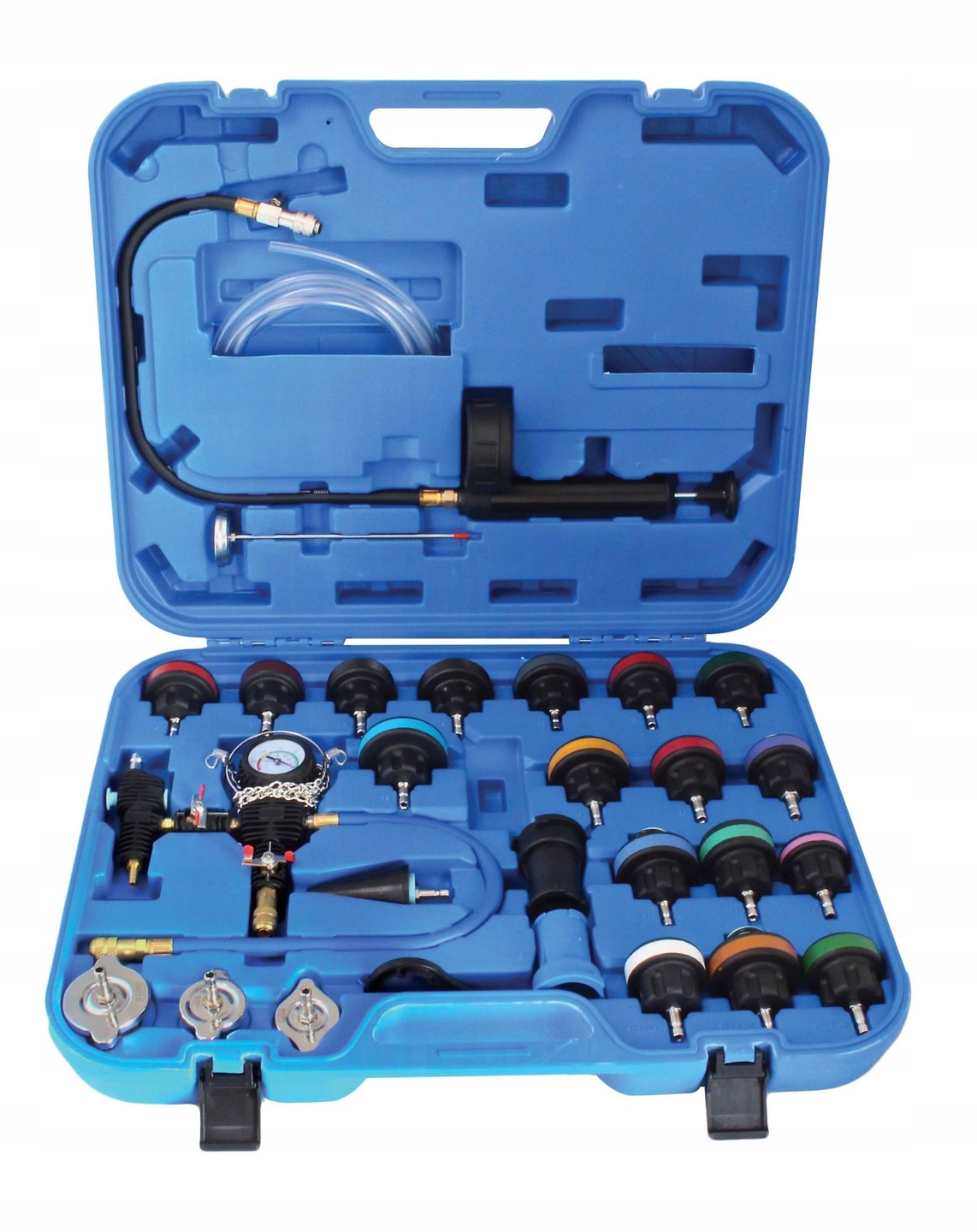27dílná sada pro testování tlaku v chladicím systému. Obsahuje pumpu s manometrem, 17 adaptérů, odvzdušňovač a hadice. Kompatibilní s většinou běžných automobilů.